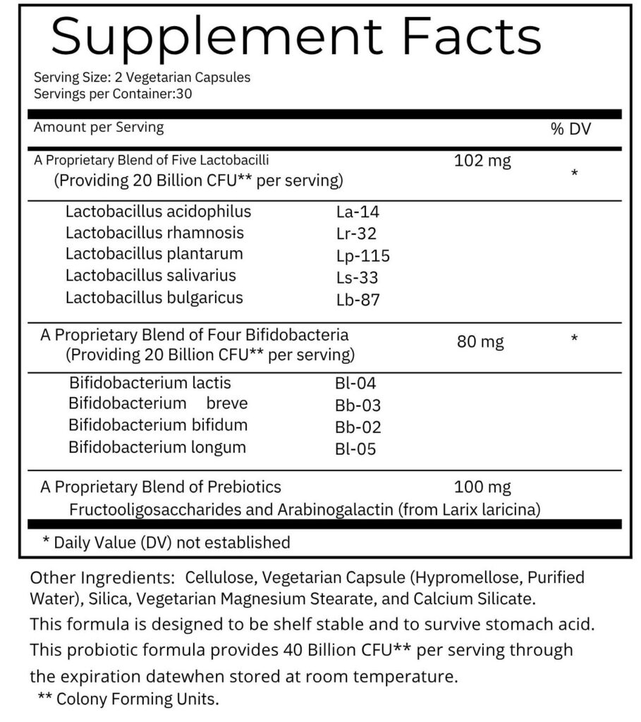 This probiotic formula is designed to be shelf stable and to survive stomach acid. This formula provides 40 Billion CFU** per serving through the expiration date when stored at room temperature. ‡